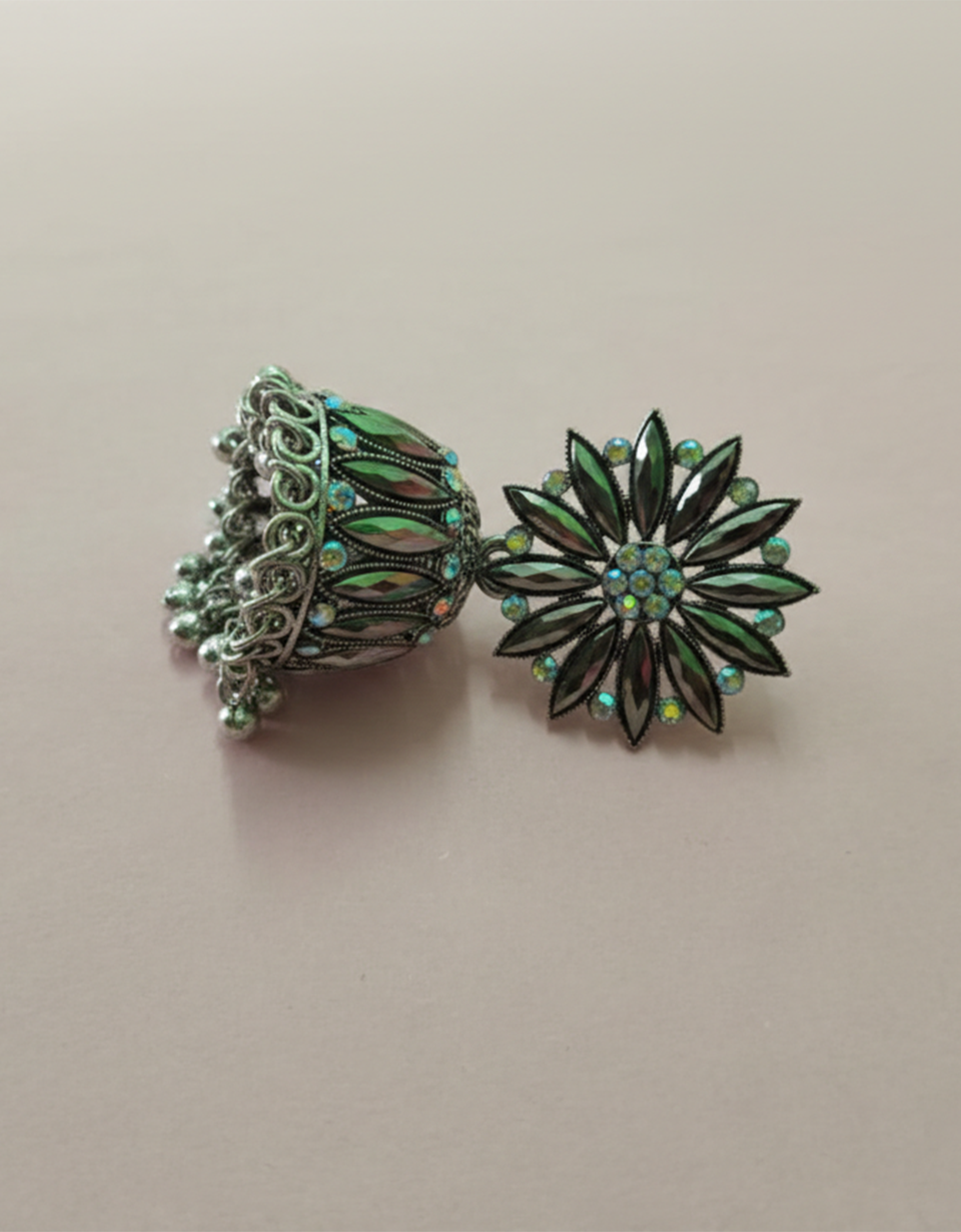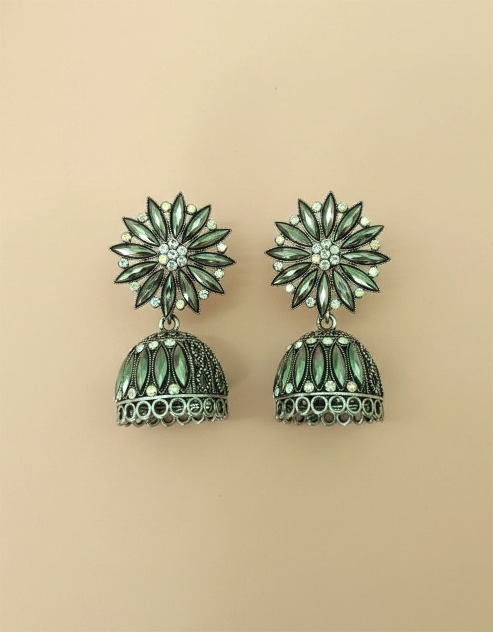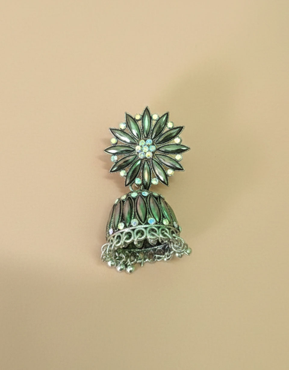 Designer silver wedding jhumka earrings with floral studs, shimmering pastel stones, and intricate dome detailing—perfect for adding traditional charm and sparkle to festive and bridal occasions.