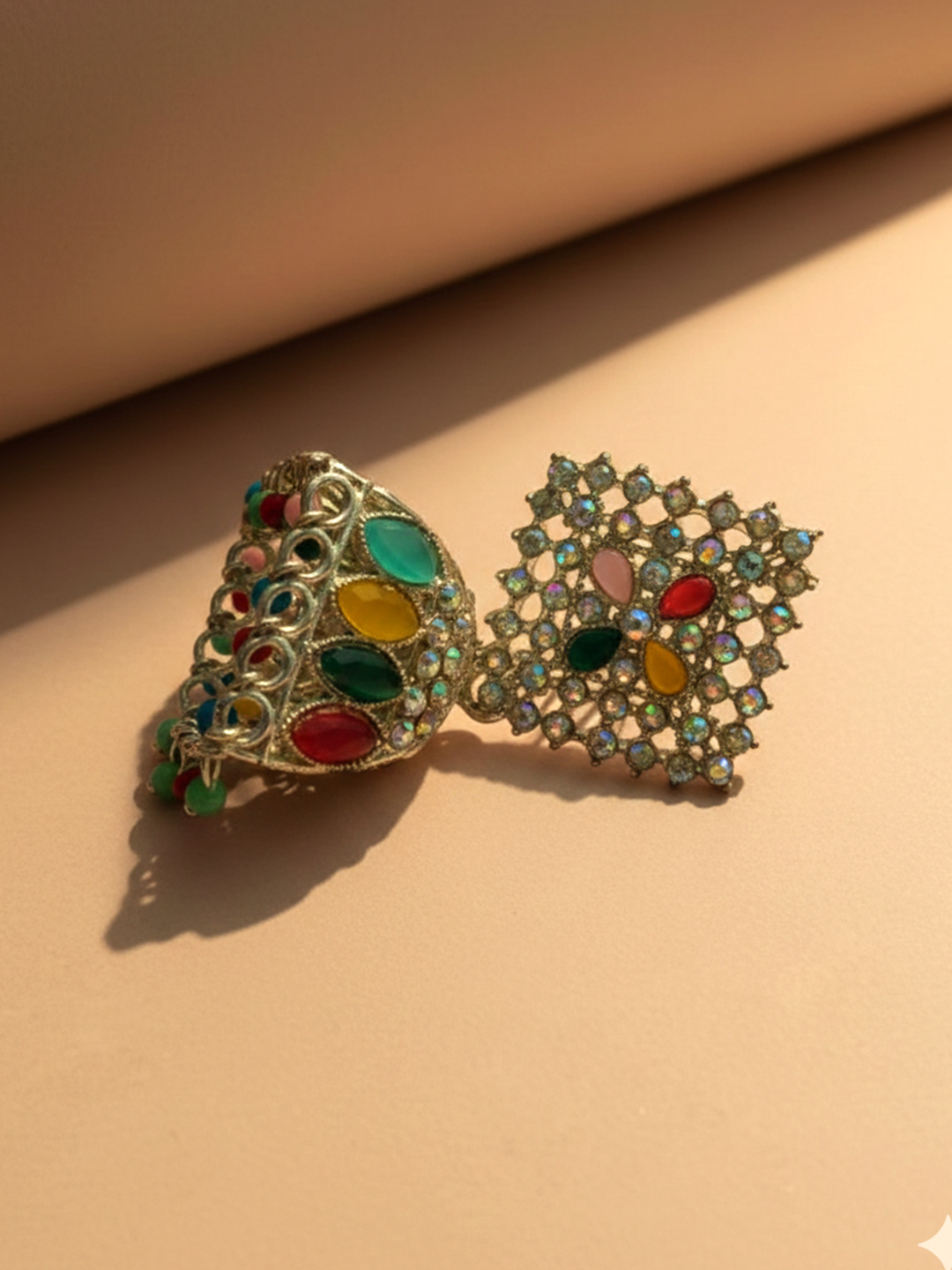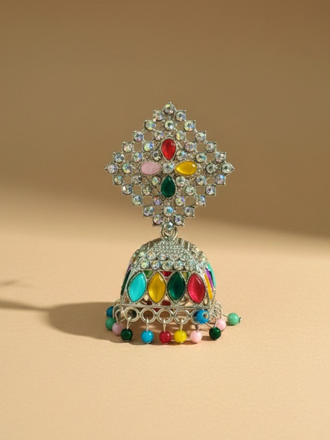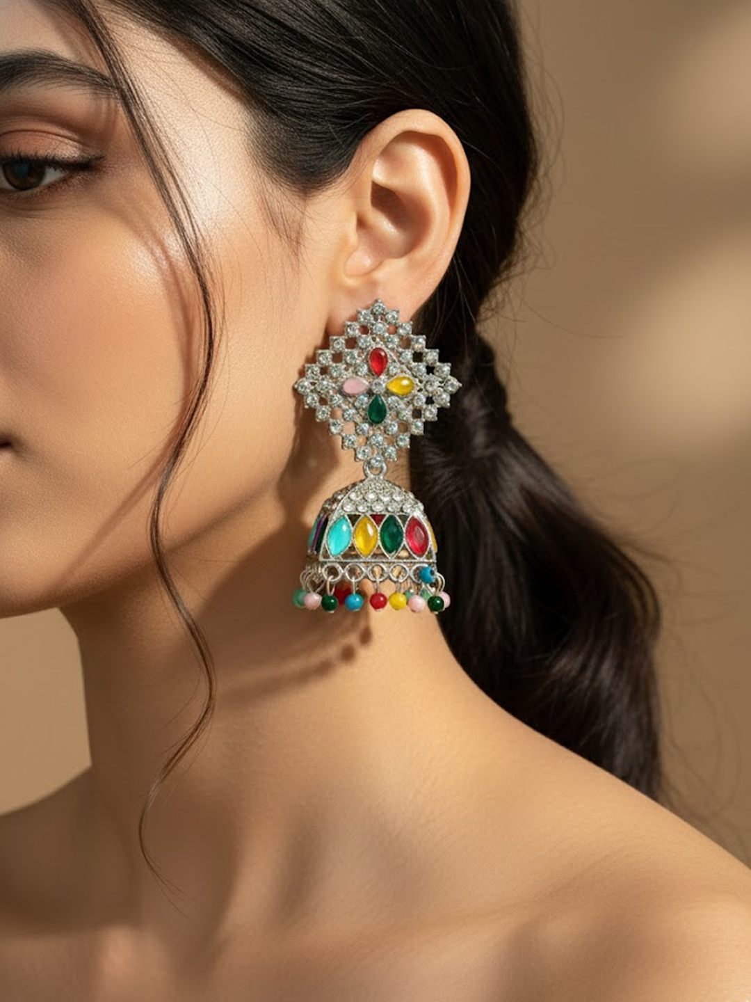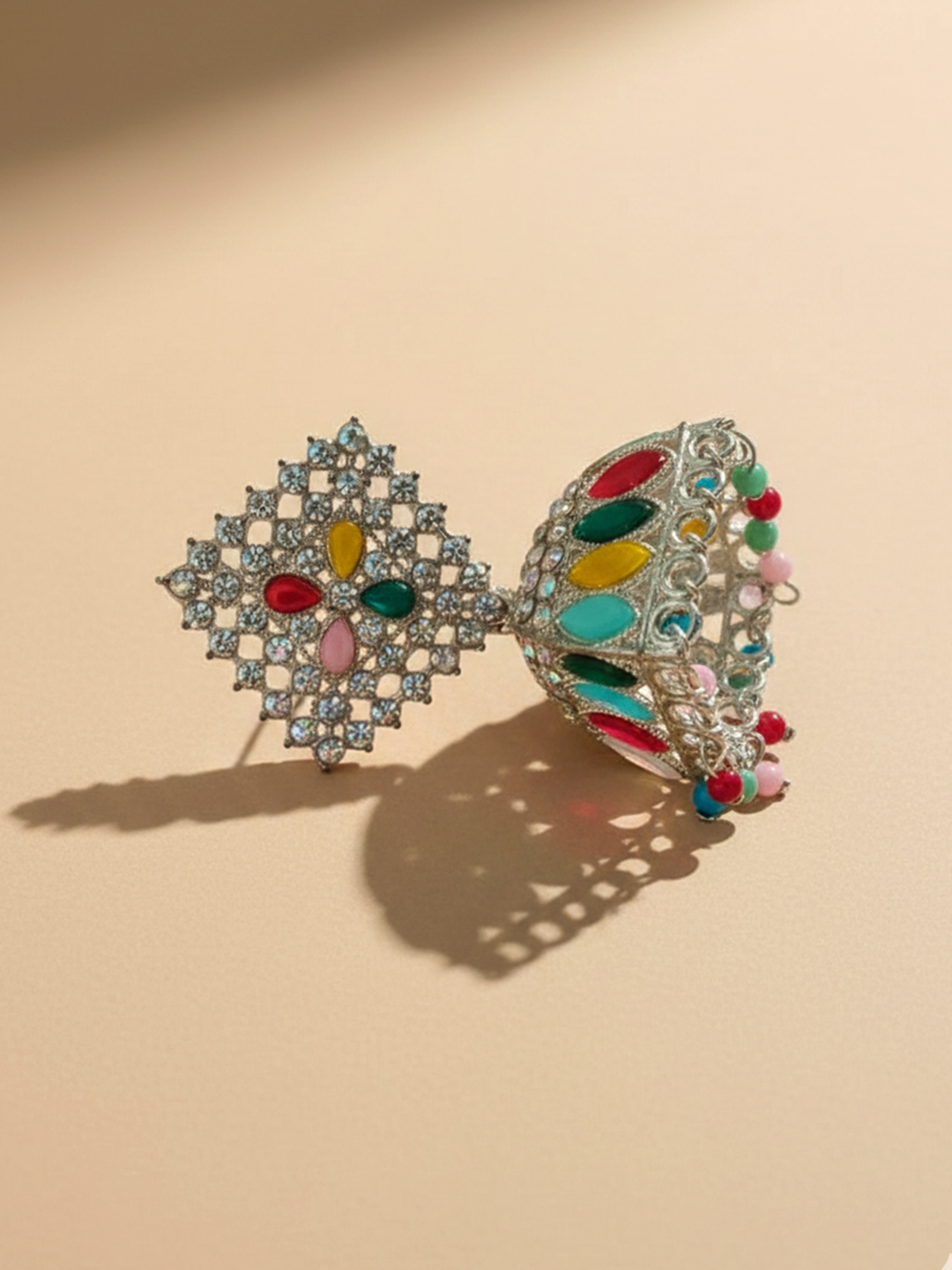 Brighten up your jewelry collection with these eye-catching Multi Colour Jhumka Earrings, a perfect blend of tradition and festive flair. Crafted with intricate detailing and adorned with vibrant enamel stones, these jhumkas boast a silver-toned base with a delicate lattice design that sparkles with every movement. The colorful teardrop motifs and embedded stones add a joyful pop of color, making them ideal for weddings, festivals, or a bold ethnic look.