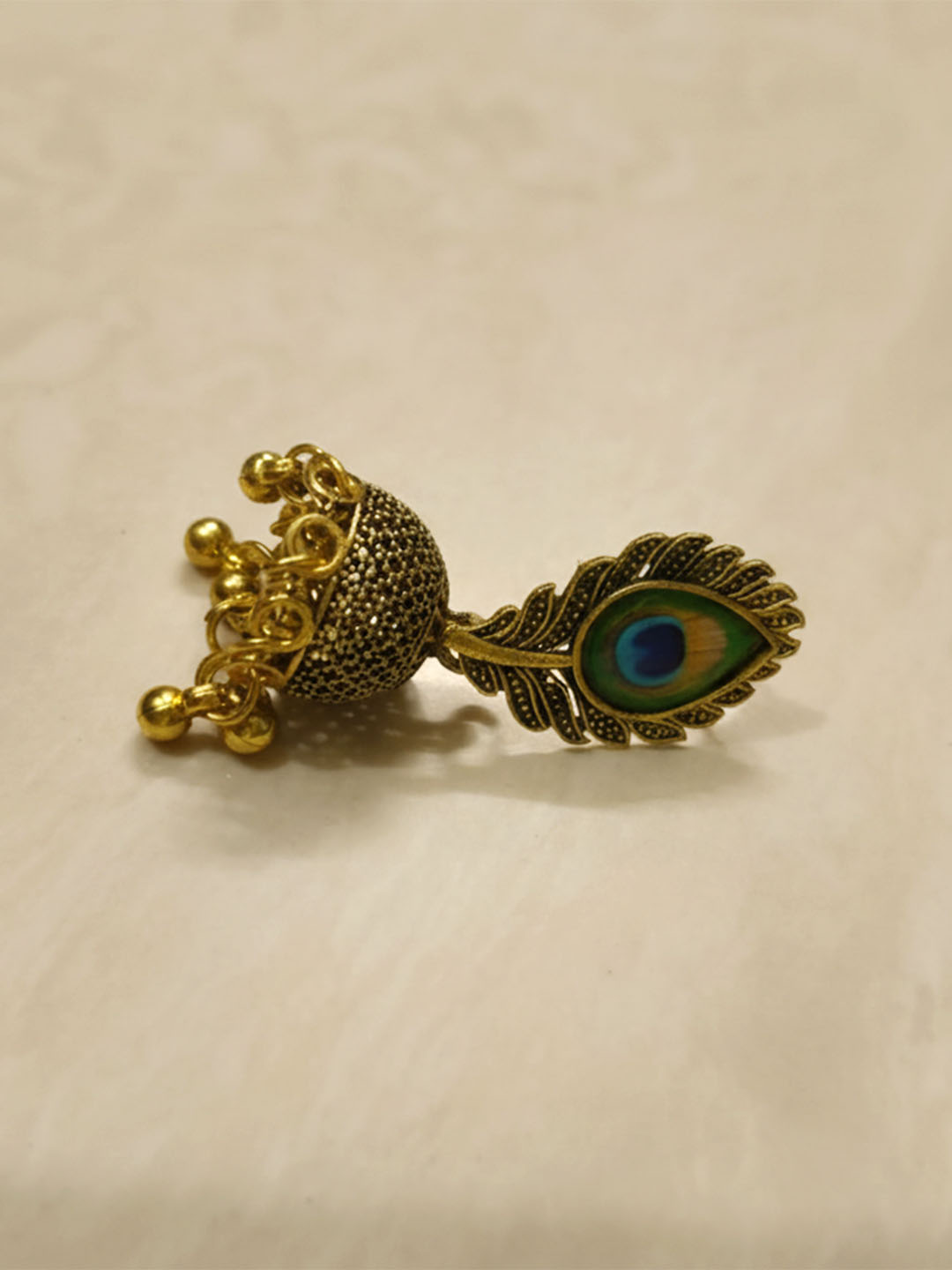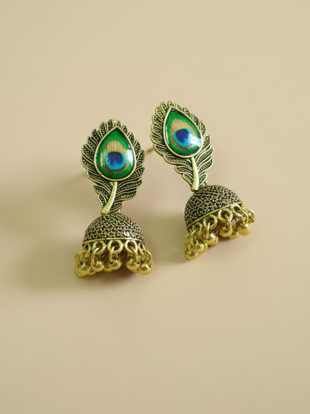 Peacock Feather Golden Colour Oxidised Jhumki inspired by the graceful beauty of peacock feathers, these earrings feature a vibrant green and blue enamel feather motif paired with intricately crafted oxidised golden jhumki domes. The antique finish and delicate hanging beads lend them a classic charm, perfect for festive occasions, traditional wear, or ethnic styling.