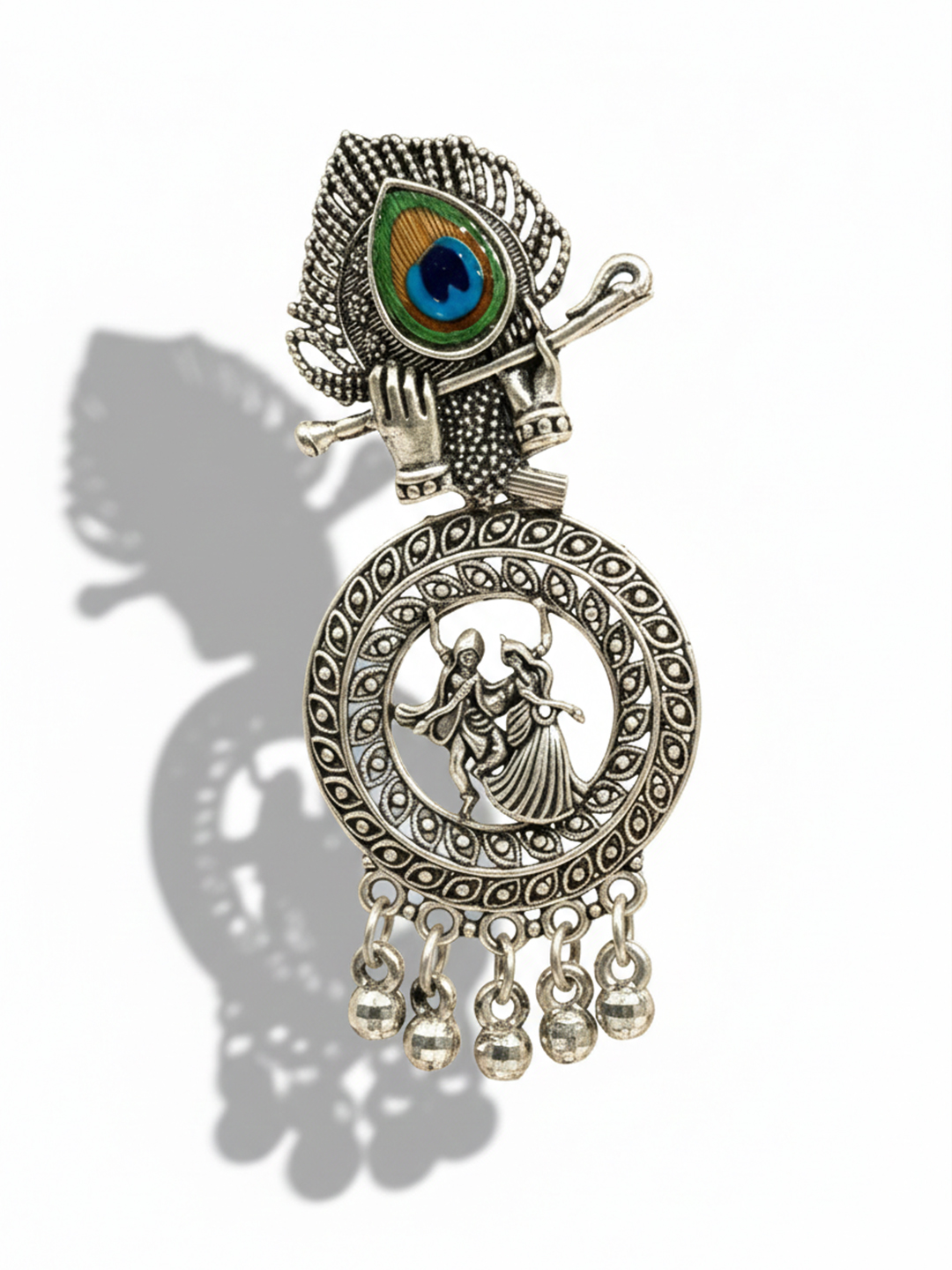 Celebrate divine love and artistry with this beautiful Silver Flute Hand Radha Krishna Jhumki. Featuring an intricately designed hand holding Lord Krishna’s flute alongside a vibrant peacock feather accent, this oxidised silver-tone earring captures the essence of devotion and tradition. The circular dangler showcases a detailed carving of Radha and Krishna, surrounded by ethnic patterns and finished with delicate metallic beads.