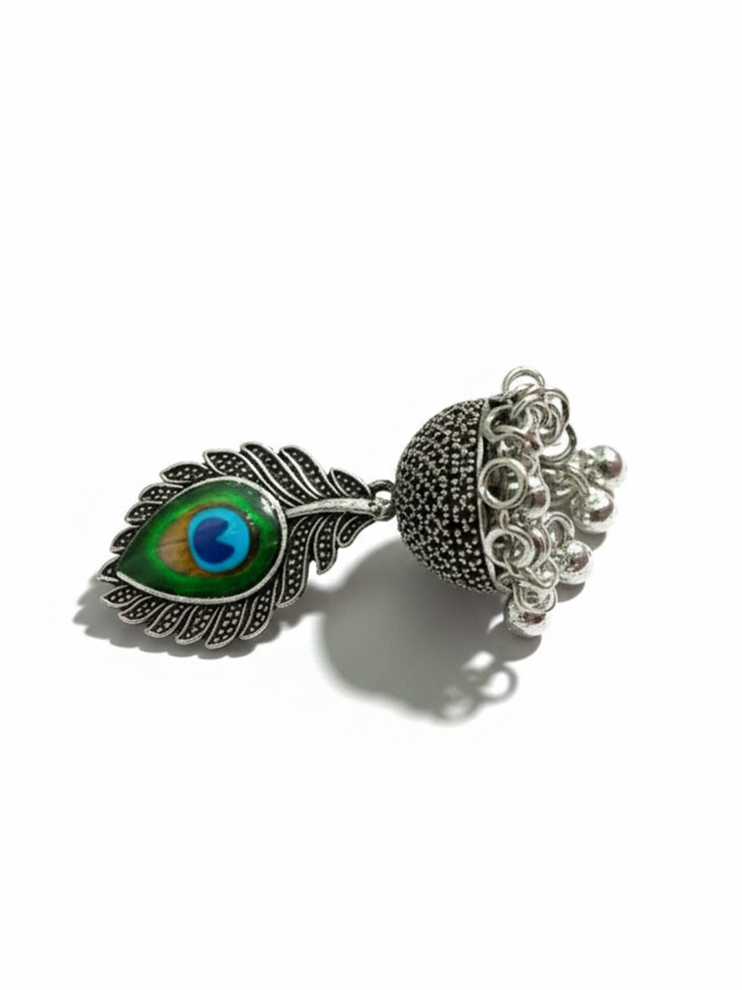 Design: Peacock feather motif with traditional dome-shaped jhumka