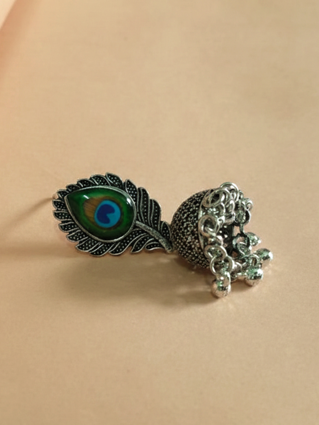 Celebrate grace, tradition, and timeless beauty with this stunning Silver Peacock Feather Jhumka by Shuve. Inspired by the elegance of Lord Krishna’s iconic feather, this oxidised silver-tone earring features a beautifully detailed peacock plume adorned with a vibrant green and blue enamel centerpiece. The classic jhumka dome below is intricately textured and finished with delicate silver bead hangings, adding a graceful sway to every movement.